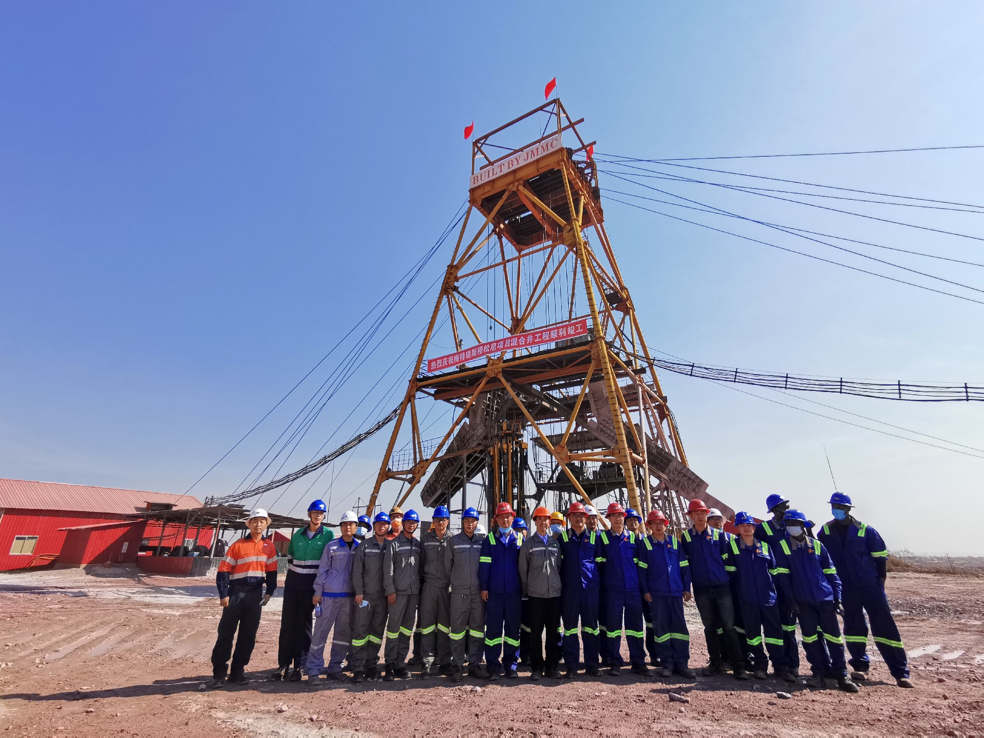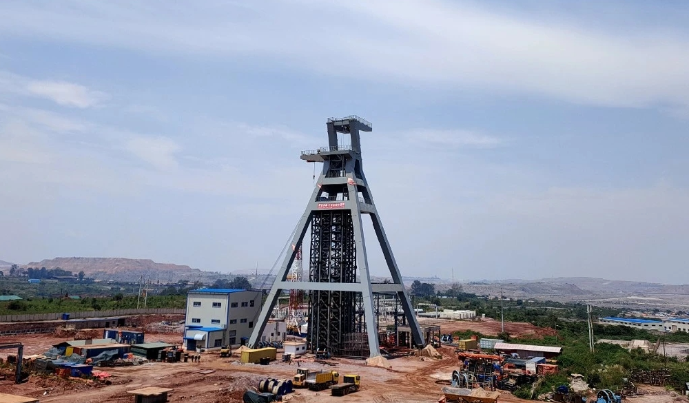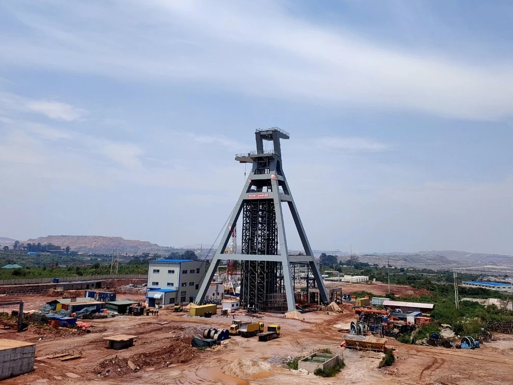 由金科项目公司承建的穆松尼铜矿混合井超大型井架主副斜架成功起立。混合井井架总高度69m,自重约2000吨,主副斜架重约1300吨,是金科项目首个超大型钢结构井架